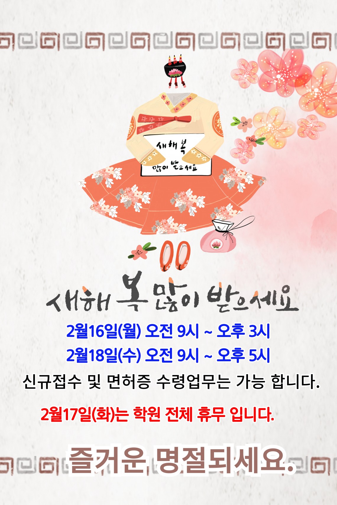 2월16일 9시 ~ 15시2월17일 학원 전체 휴무2월18일 9시 ~ 17시신규등록 상담 가능 합니다. 2026년에도 좋은 일만 가득하시길 바랍니다.